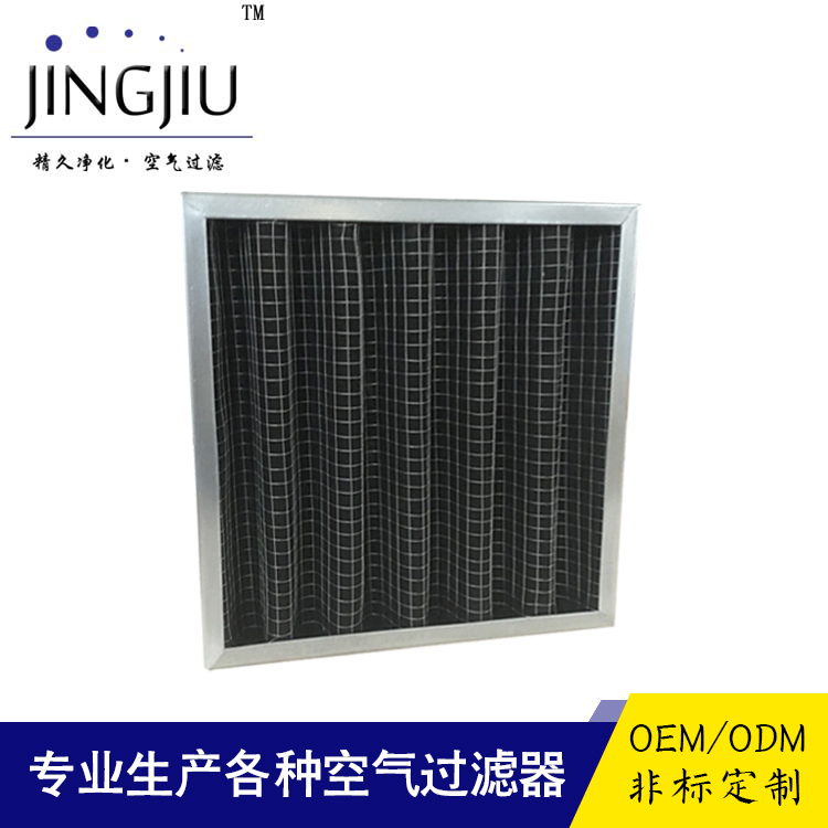 活性炭空氣過(guò)濾器 活性炭過(guò)濾器通過(guò)比較過(guò)濾器中活性炭材料的多少可以粗略估計(jì)過(guò)濾器的 能力。例如,一只迎風(fēng)面為610mmx610mm過(guò)濾器中含30kg最 普通的顆?;钚蕴?另一只所謂高科技新產(chǎn)品中含2kg活性炭, 那個(gè)新產(chǎn)品的活性炭可能比顆粒炭的單位吸附容量大許多,但它 的使用壽命也就是那只普通顆粒炭過(guò)濾器的十分之通過(guò)監(jiān)測(cè)過(guò)濾器前后污染物的濃度變化,可以判定活性炭是否應(yīng)更換。但目前國(guó)內(nèi)尚無(wú)實(shí)用、方便的監(jiān)測(cè)手段,因此,用戶只能按規(guī)定周期或憑經(jīng)驗(yàn)決定活性炭過(guò)濾器的使用壽命。